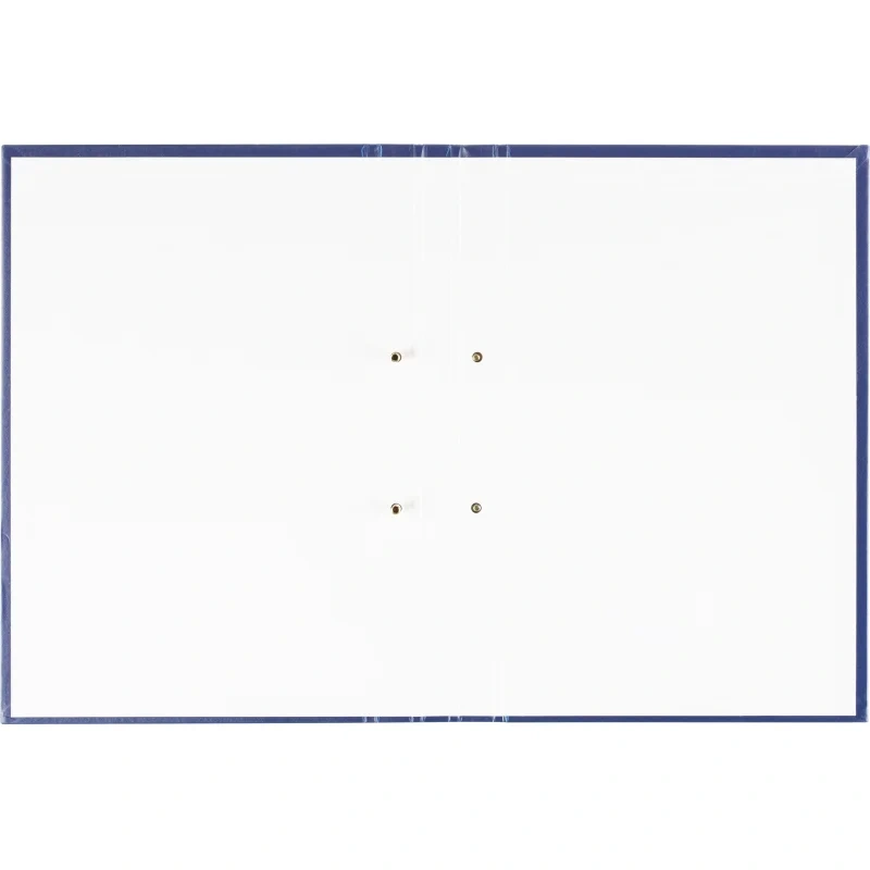Папка адресная изготовлена из плотного переплётного картона 1,5 мм, обтянутого бумвинилом снаружи и обклеенного внутри белой бумагой. Предусмотрено два отверстия в корешке для крепления вложения болтами золотистого цвета. Папка рассчитана на 150-180 листов. Тиснение на передней стороне папки также выполнено золотистым цветом.