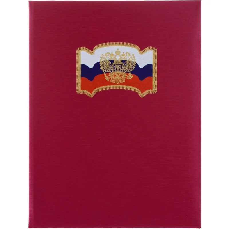 Папка адресная Государственная Символика А4 балакрон красная. Предназначена для подачи документов на подпись руководителю и для проведения торжественных церемоний, вручения наград, благодарностей и почетных грамот, а также для оформления поздравлений и приветственных речей. Адресная папка формата А4 изготовлена из балакрона (ПВХ с имитацией кожи) красного цвета. На обложке изображен российский флаг, на который с помощью тиснения фольгой нанесены герб и окантовка. Благодаря строгому дизайну она подойдет для использования в государственных учреждениях и ведомствах. Этот стильный акцент способствует созданию деловой атмосферы и подчеркивает внимание к деталям. На данный товар можно нанести логотип.