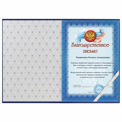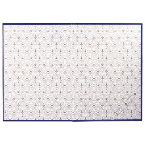 Изготовлена из прочного картона, покрытого бумвинилом. Папка формата А4 универсального назначения выполнена в насыщенном синем цвете. На обложке - орнамент, нанесенный с помощью золотого тиснения. Снабжена лентой для удержания документов (ляссе). Предусмотрено нанесение логотипа.