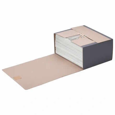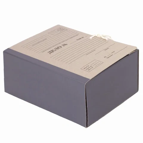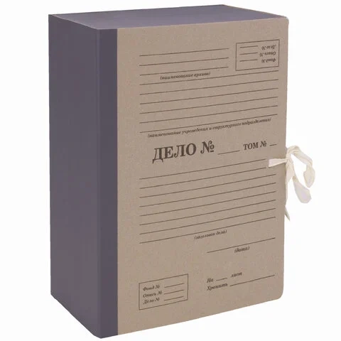 Папка стандартного формата А4 вмещает до 1500 листов. Изготовлена из переплетного картона с покрытием из бумвинила. Ширина корешка составляет 15 мм. На лицевой стороне есть поля для подписывания. Закрывается с помощью 4-х тканевых завязок.