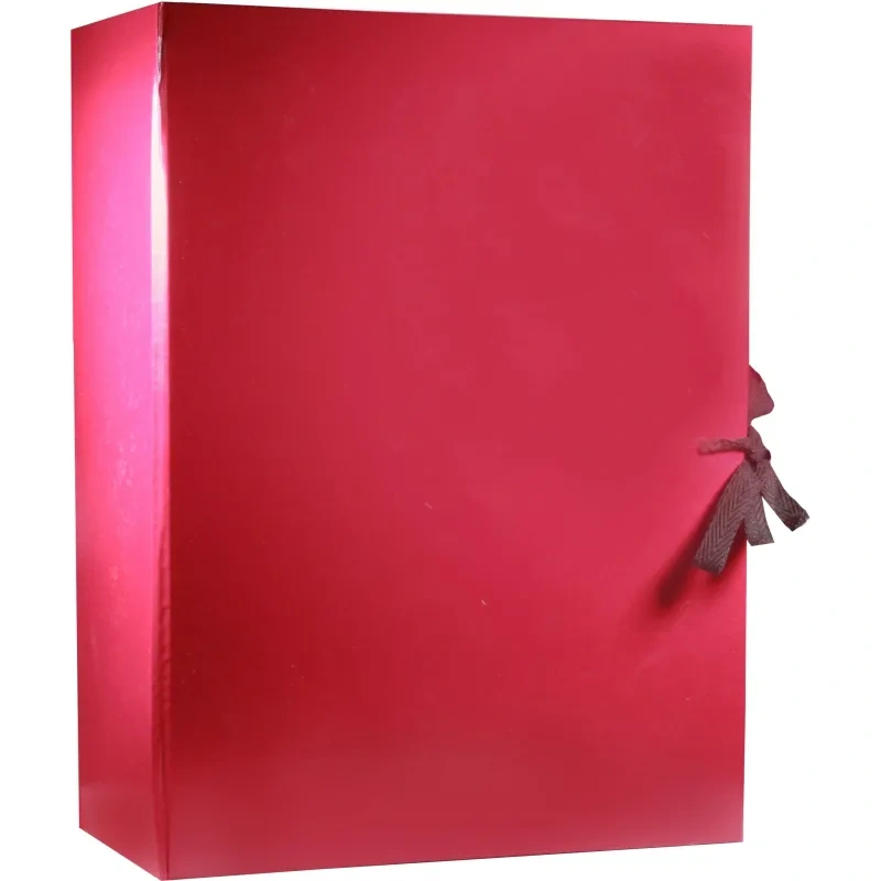 Складной архивный короб Attache (Attache Economy) формата А4 изготовлен из переплётного картона, снаружи покрыт бумвинилом бордового цвета (материал на основе ПВХ). В закрытом виде фиксируется с помощью двух хлопчатобумажных завязок. Внутренние стойки-упоры выполнены из гофрокартона. Короб вмещает до 1200 листов стандартной плотности, ширина корешка — 120 мм. Позволяет надежно хранить документы как в вертикальном, так и в горизонтальном положении. Внутренний размер: 220×120×310 мм.