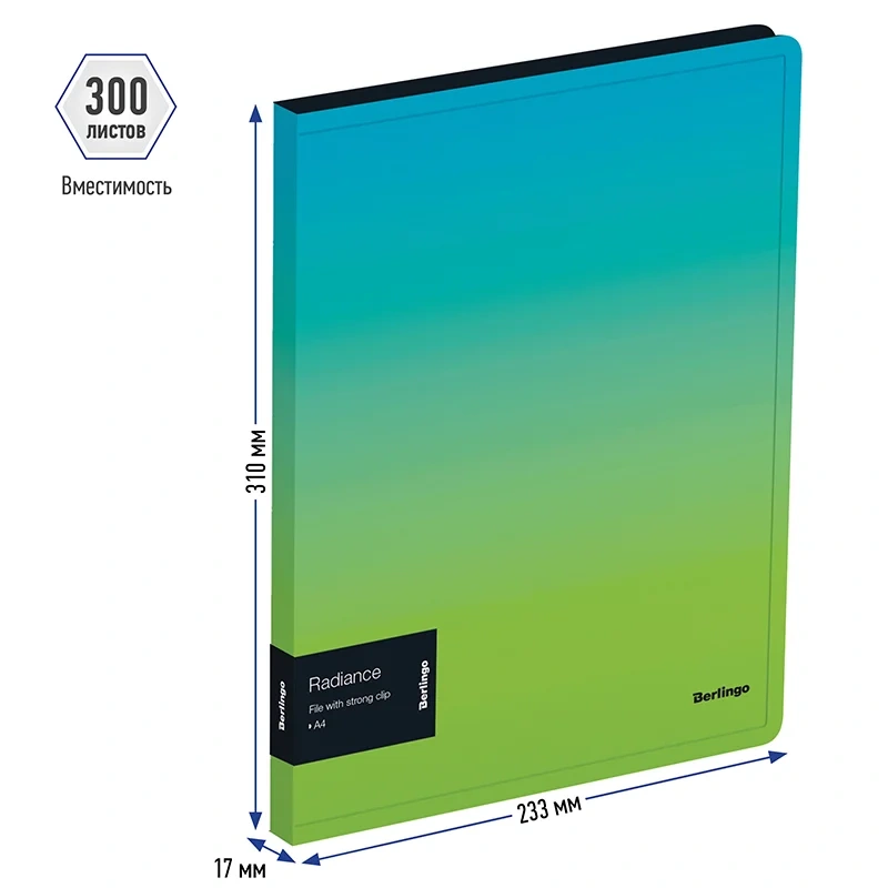 Папка с зажимом Berlingo серии Radiance формата А4 – это стильный аксессуар для работы и учебы благодаря дизайну с сочетанием голубого/зеленого градиента и контрастной чёрной внутренней стороной. Папка размером 310*231 мм изготовлена из высококачественного полипропилена толщиной 600 мкм с текстурой «песок», на которой не видно отпечатков пальцев и мелких царапин. Папка с зажимом предназначена для хранения документов. Ширина корешка составляет 17 мм. Изделие имеет крепкий и надёжный хромированный зажим.