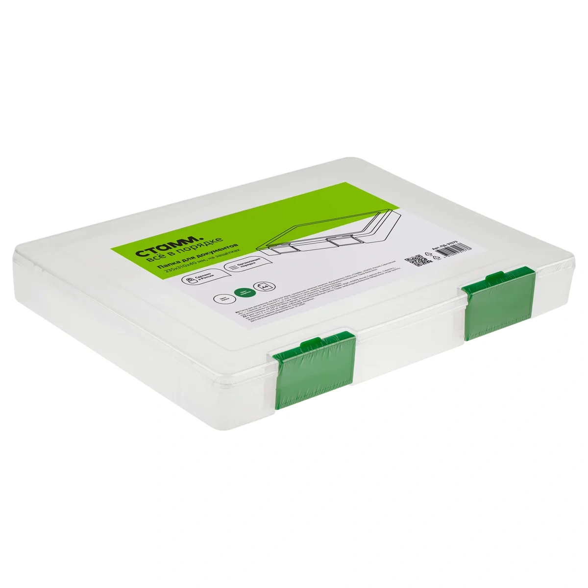 Папка для документов «СТАММ» предназначена для хранения и переноски бумаг формата А4. Изделие размером 235*310*40 мм вмещает до 250 листов. Лёгкая и прочная папка изготовлена из качественного полипропилена. Корпус прозрачной папки оборудован двумя надёжными защёлками зелёного цвета. Изделие поставляется в индивидуальной упаковке в термоусадочной плёнке.