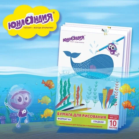 Папка для рисования А4, 10 листов, 160 г/м2, ЮНЛАНДИЯ, 210х297 мм, 'Юнландик и кит', 111076