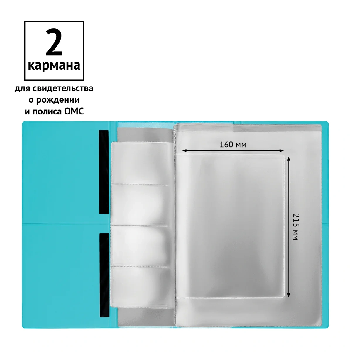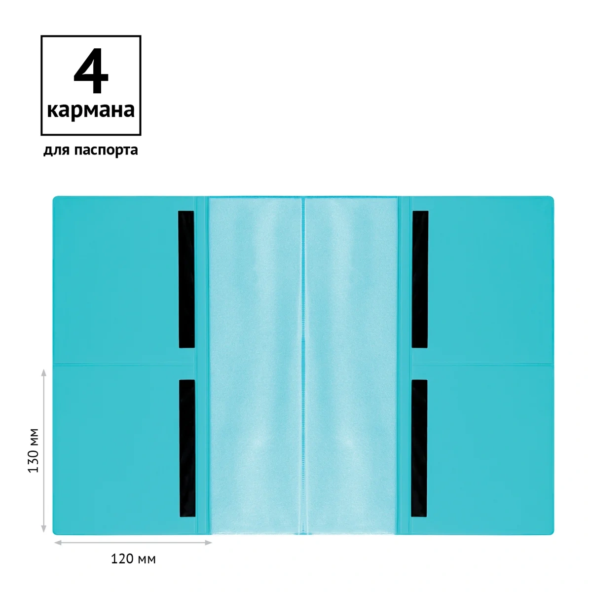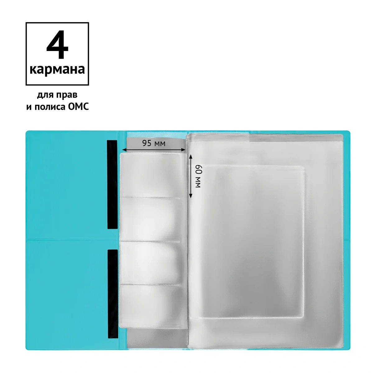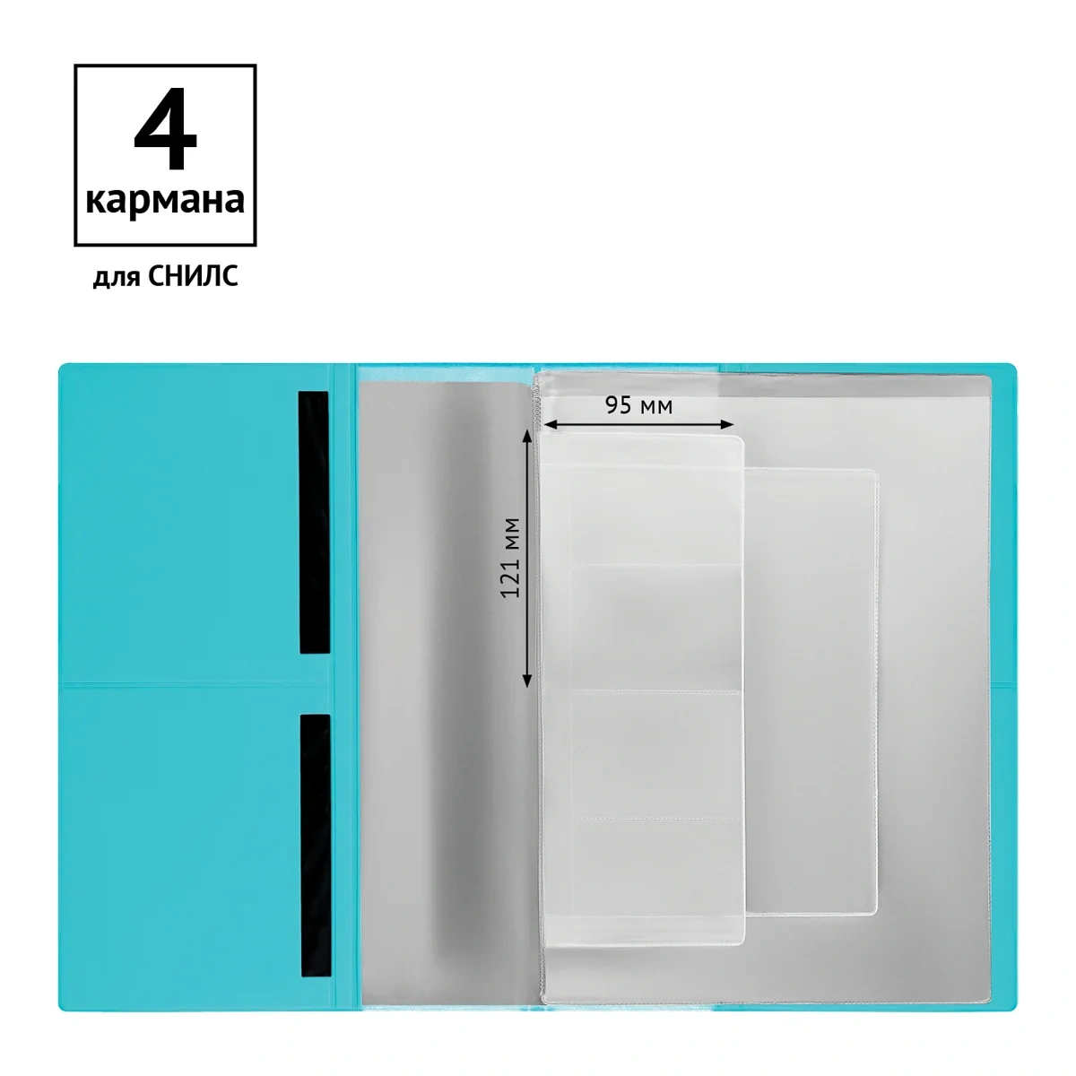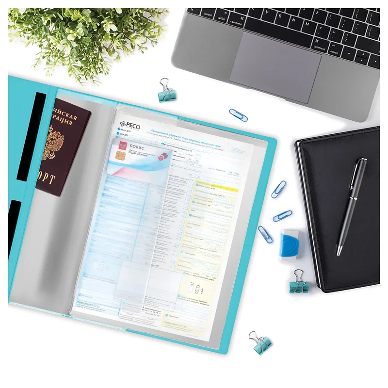 Папка OfficeSpace для хранения личных документов семьи. Изделие рассчитано на четыре персоны разных годов рождения. В нем предусмотрены отделения для всех видов документов старого и нового образцов, карточек. Папка формата А4 (225*315 мм) изготовлена из полиуретана бирюзового цвета.