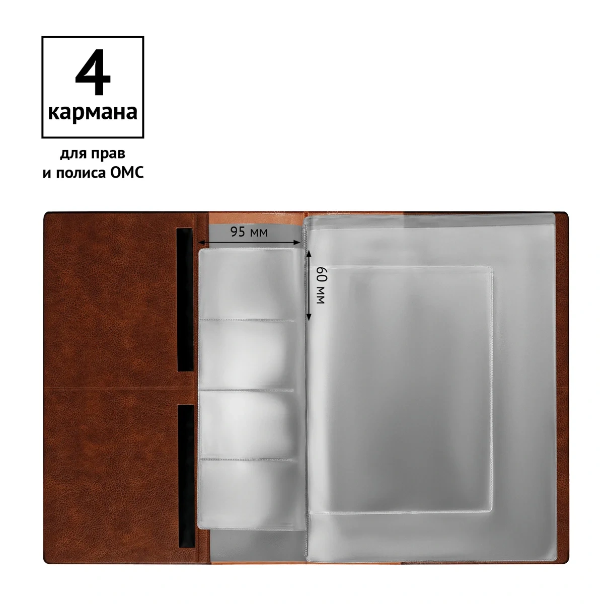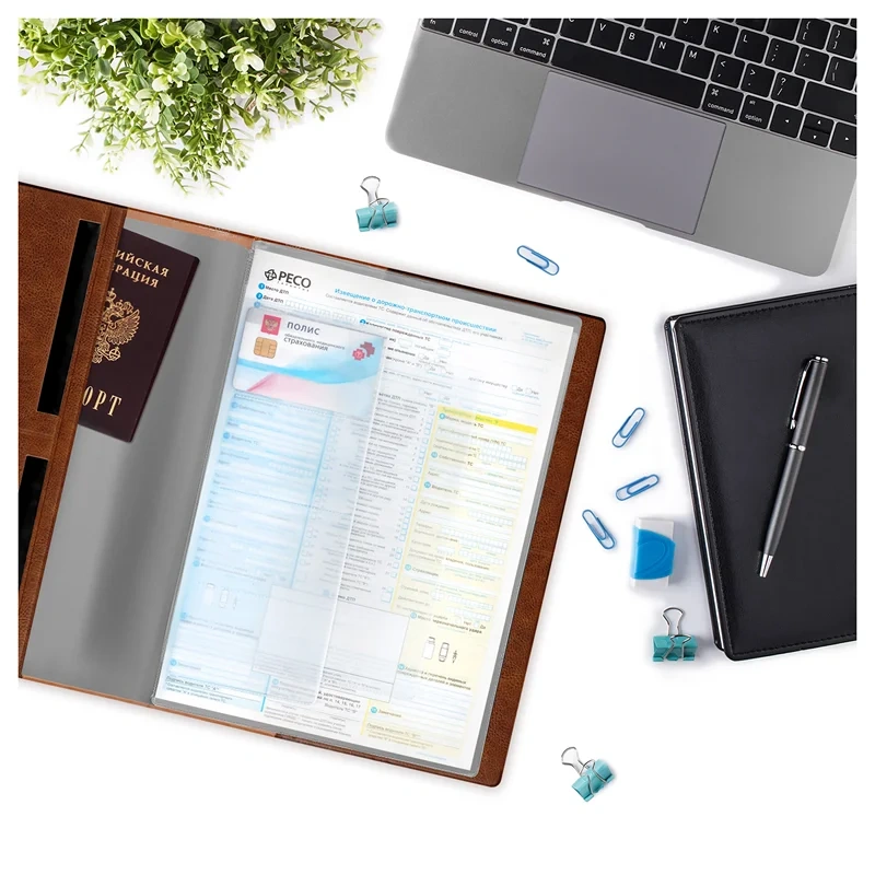 Папка OfficeSpace для хранения личных документов семьи. Изделие рассчитано на четыре персоны разных годов рождения. В нем предусмотрены отделения для всех видов документов старого и нового образцов, карточек. Папка формата А4 (225*315 мм) изготовлена из полиуретана коричневого цвета.