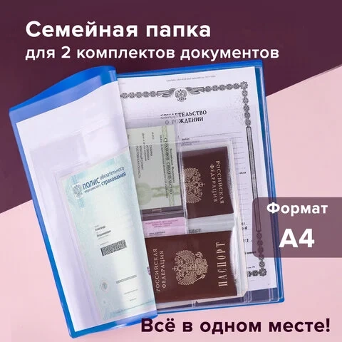 Папка для семейных документов с мягкой обложкой включает в себя: 2 файла для документов формата А4, 2 файла для свидетельств о рождении старого образца, 2 файла для полисов ОМС, 4 кармана для паспортов, 4 кармана для карт ОМС или других карт, 2 кармана для СНИЛС. Изготовлена из высококачественного прочного ПВХ, который обеспечит вашим документам надежную защиту от влаги, пыли и прочих повреждений.