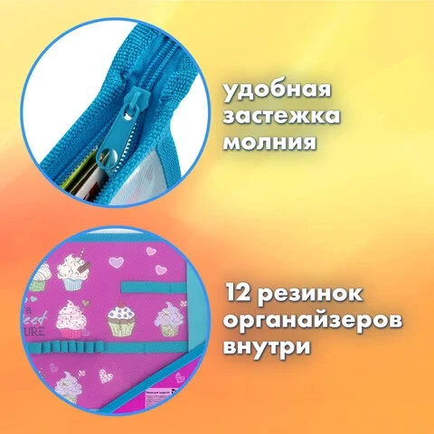 Папка для труда BRAUBERG А4, 2 отделения, пластик, молния сверху, органайзер, 'Cup Cakes', 229134