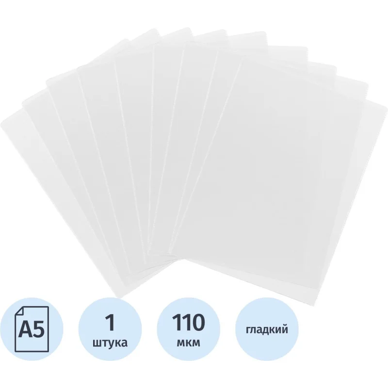 Файл-карман А5, вертикальный, без перфорации. Предназначен для хранения документов А5. Сделан из плотного, прозрачного, фактурного ПВХ, плотность 110 мкм. Стоимость указана за один файл.