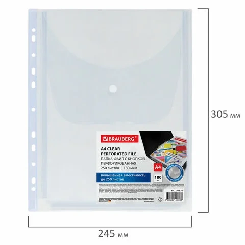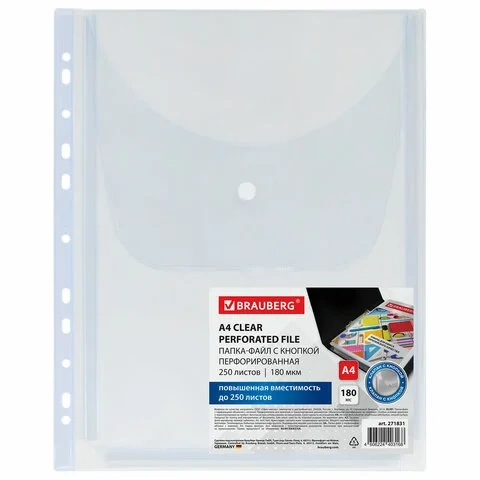 Папка-файл с перфорацией 1 штука с кнопкой БОЛЬШОЙ ВМЕСТИМОСТИ до 250 л., ПВХ 180 мкм, BRAUBERG, 271