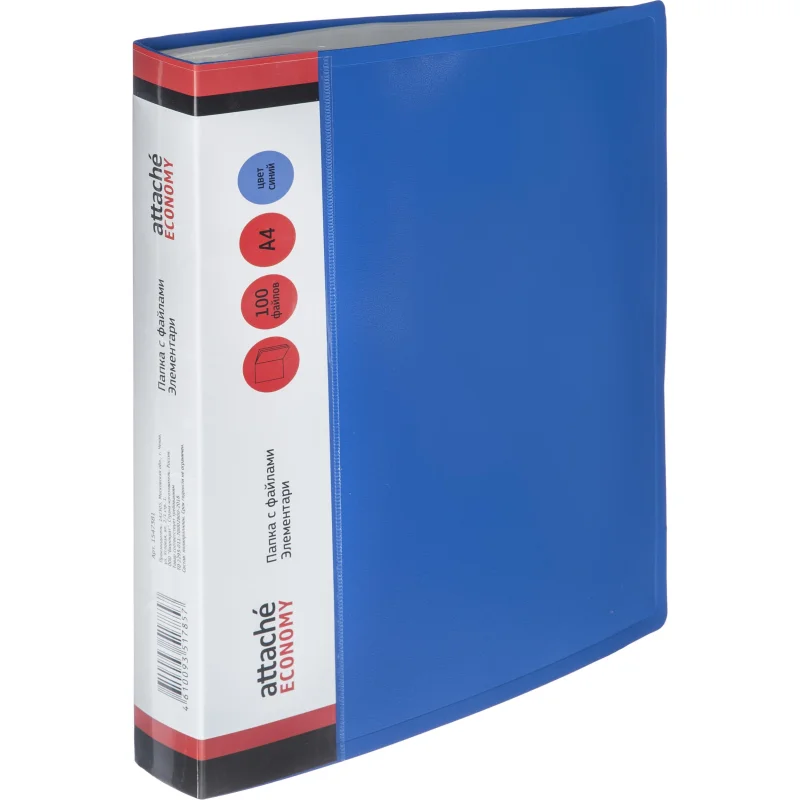 Папка файловая 100 файлов, карман/кор Attache Economy Элемент А4 800мкм син Папка с файлами Attache Economy предназначена для хранения материалов и документов формата А4, требующих упорядоченности и наглядного обзора: отчетов, презентаций, коммерческих и персональных портфолио. Изготовлена из жесткого высококачественного пластика толщиной 0.8 мм синего цвета, имеет 100 прозрачных вкладышей, а также карман на корешке для сменной этикетки. Вмещает до 200 листов стандартной плотности. Преимуществом файловой папки является надежная сохранность документов в отличном состоянии без предварительной перфорации. Плотность файлов 30 мкм.Законодательные и технические документы: