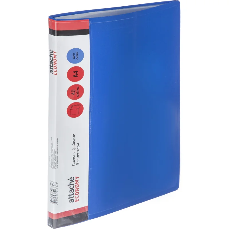 Папка с файлами Attache Economy предназначена для хранения материалов и документов формата А4, требующих упорядоченности и наглядного обзора: отчетов, презентаций, коммерческих и персональных портфолио. Изготовлена из жесткого высококачественного пластика толщиной 0.7 мм синего цвета, имеет 40 прозрачных вкладышей, а также карман на корешке для сменной этикетки. Вмещает до 80 листов стандартной плотности. Преимуществом файловой папки является надежная сохранность документов в отличном состоянии без предварительной перфорации. Плотность файлов 30 мкм.