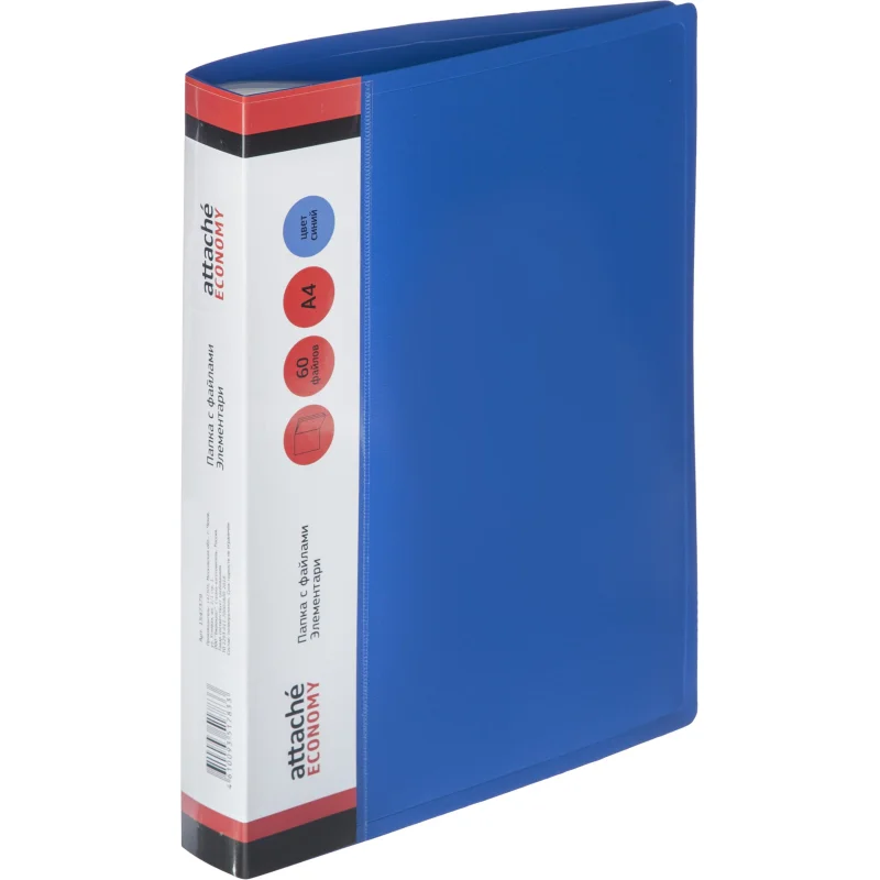 Папка с файлами Attache Economy предназначена для хранения материалов и документов формата А4, требующих упорядоченности и наглядного обзора: отчетов, презентаций, коммерческих и персональных портфолио. Изготовлена из жесткого высококачественного пластика толщиной 0.7 мм синего цвета, имеет 60 прозрачных вкладышей, а также карман на корешке для сменной этикетки. Вмещает до 120 листов стандартной плотности. Преимуществом файловой папки является надежная сохранность документов в отличном состоянии без предварительной перфорации. Плотность файлов 30 мкм.