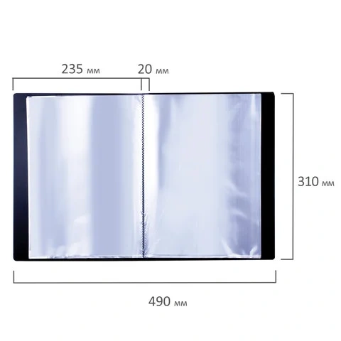 На корешке имеется карман для маркировки содержимого. Папка изготовлена из качественного пластика толщиной 0,6 мм с антибликовой фактурой, а ширина корешка составляет 20 мм. Содержит 30 вкладышей, позволяющих хранить документы формата А4 и обеспечивающих их надежную защиту от попадания влаги, пыли и прочих повреждений. Поставляется в индивидуальной упаковке.