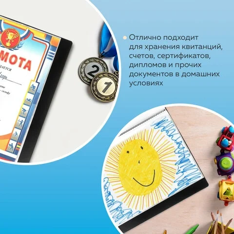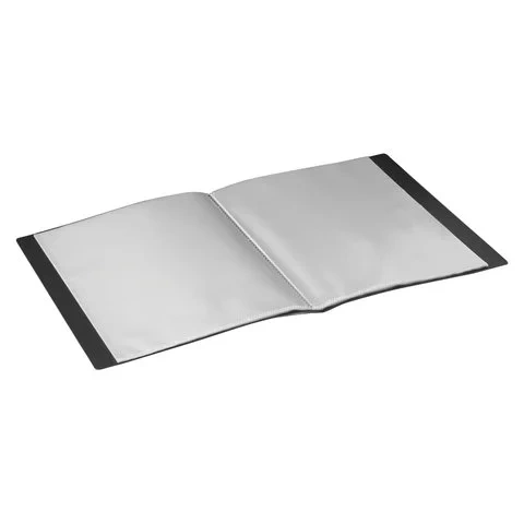 На корешке имеется карман для маркировки содержимого. Папка изготовлена из качественного пластика толщиной 0,7 мм с антибликовой фактурой, а ширина корешка составляет 25 мм. Содержит 40 вкладышей, позволяющих хранить документы формата А4 и обеспечивающих их надежную защиту от попадания влаги, пыли и прочих повреждений. Поставляется в индивидуальной упаковке.