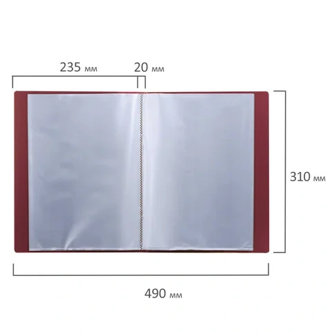 На корешке имеется карман для маркировки содержимого. Папка изготовлена из качественного пластика толщиной 0,6 мм с антибликовой фактурой, а ширина корешка составляет 20 мм. Содержит 30 вкладышей, позволяющих хранить документы формата А4 и обеспечивающих их надежную защиту от попадания влаги, пыли и прочих повреждений. Поставляется в индивидуальной упаковке.