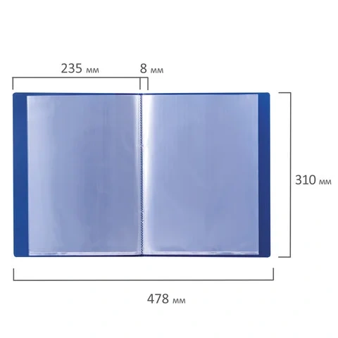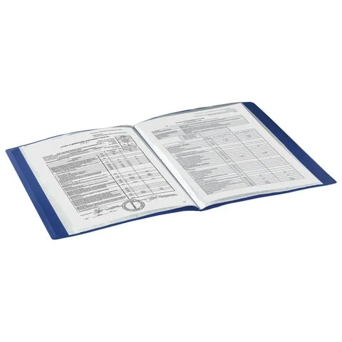 На корешке имеется карман для маркировки содержимого. Папка изготовлена из качественного пластика толщиной 0,5 мм с антибликовой фактурой, а ширина корешка составляет 8 мм. Содержит 10 вкладышей, позволяющих хранить документы формата А4 и обеспечивающих их нажежную защиту от попадания влаги, пыли и прочих повреждений. Поставляется в индивидуальной упаковке.