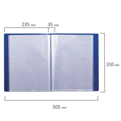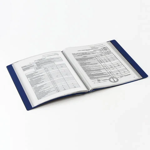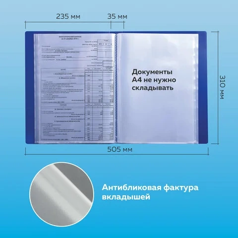 На корешке имеется карман для маркировки содержимого. Папка изготовлена из качественного пластика толщиной 0,9 мм с антибликовой фактурой, а ширина корешка составляет 35 мм. Содержит 80 вкладышей, позволяющих хранить документы формата А4 и обеспечивающих их надежную защиту от попадания влаги, пыли и прочих повреждений. Поставляется в индивидуальной упаковке.