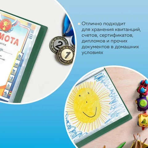 На корешке имеется карман для маркировки содержимого. Папка изготовлена из качественного пластика толщиной 0,7 мм с антибликовой фактурой, а ширина корешка составляет 25 мм. Содержит 40 вкладышей, позволяющих хранить документы формата А4 и обеспечивающих их надежную защиту от попадания влаги, пыли и прочих повреждений. Поставляется в индивидуальной упаковке.