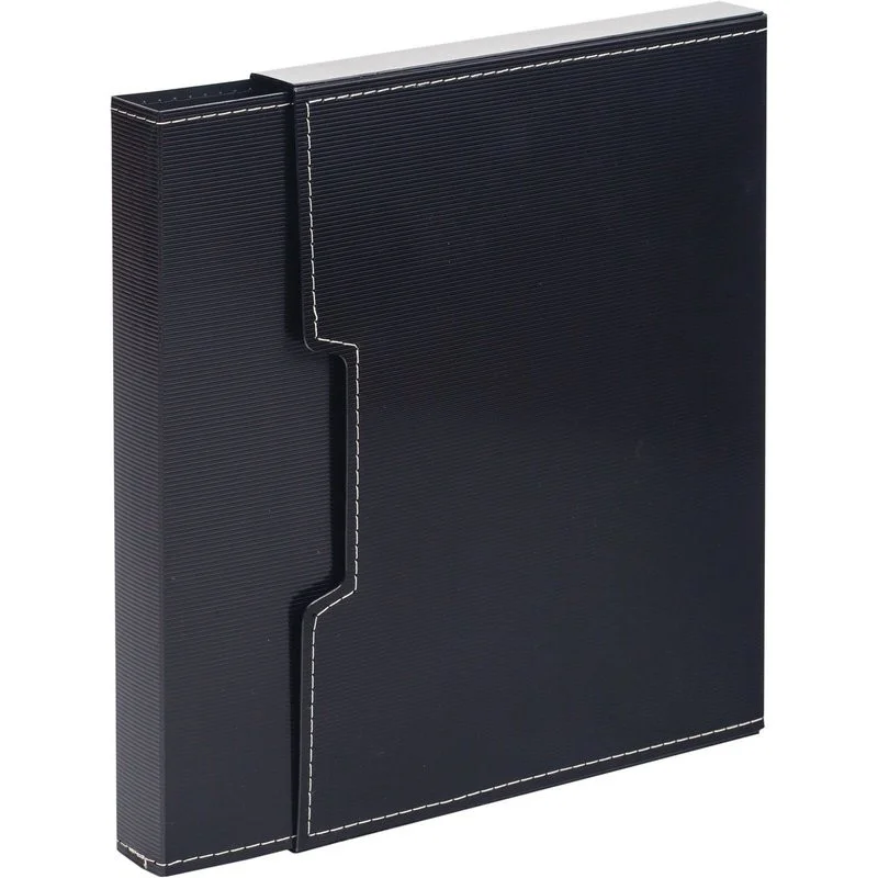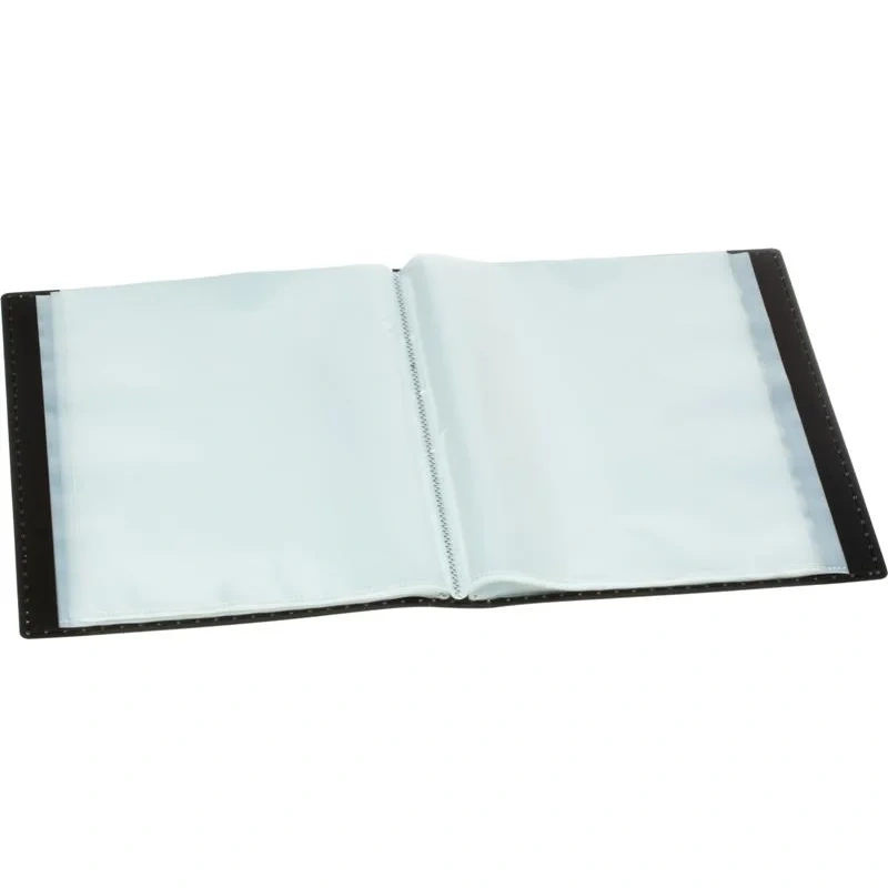Удобная и практичная файловая папка формата А4 изготовлена из жесткого полипропилена черного цвета толщиной 1 мм. Имеет 100 несъемных прозрачных вкладышей, в каждый из которых можно вложить до двух листов. Подходит для хранения и демонстрации документов на презентациях, совещаниях, создания портфолио. Папка с файлами вложена в пластиковый бокс, который позволяет ставить ее на стол. В боксе предусмотрены выемки для легкого извлечения папки. Оба предмета декорированы окантовкой в виде прострочки. Плотность файлов 35 мкм.