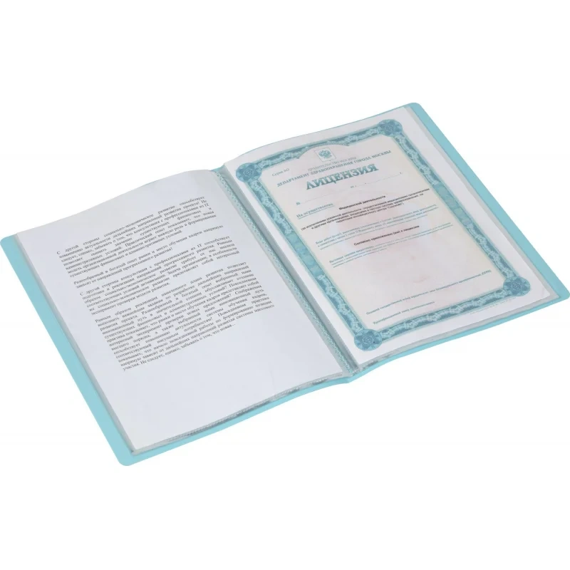 Папка с вкладышами изготовлена из полипропилена плотностью 0,35 мм. Поверхность с тиснением «кожа». Предназначена для хранения и транспортировки бумажных документов. Надежно защищает документы от смятия и загрязнения. Плотность файлов 30 мкм.