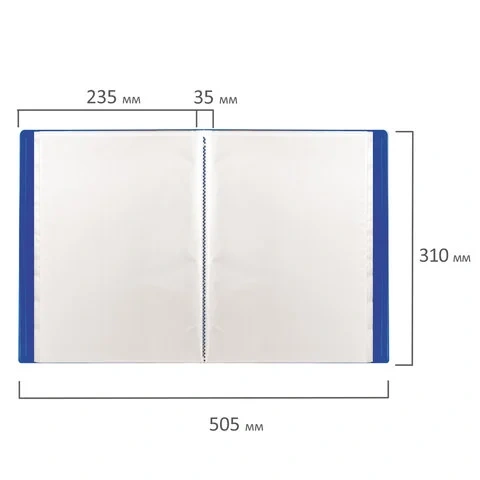 Для маркировки содержимого на корешок наклеена этикетка. Папка изготовлена из пластика толщиной 0,7 мм с антибликовой фактурой, а ширина корешка составляет 35 мм. Содержит 80 вкладышей, позволяющих хранить документы формата А4 и обеспечивающих их надежную защиту от попадания влаги, пыли и прочих повреждений.