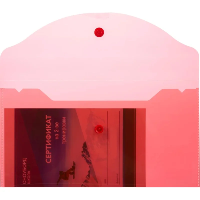 Папка-конверт размером формата А6 изготовлена из прозрачного пластика толщиной 0,18 мм. Закрывается на кнопку. Вмещает до 80 листов. Удобна для хранения и переноски документов, предотвращает их смятие и загрязнение. Размер: 135?250 мм.