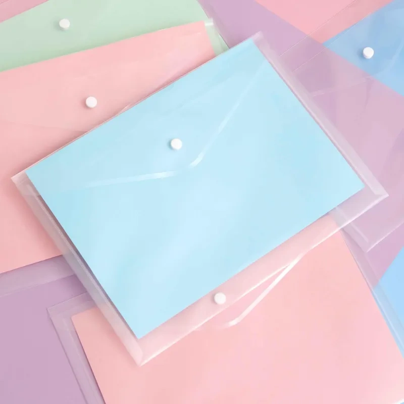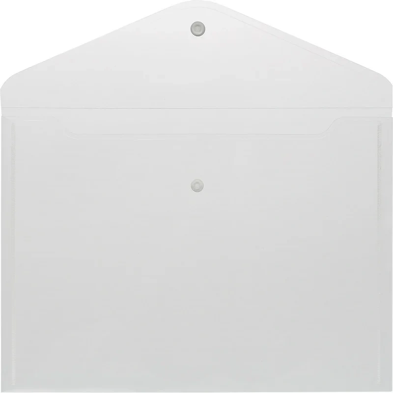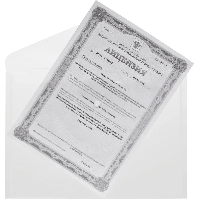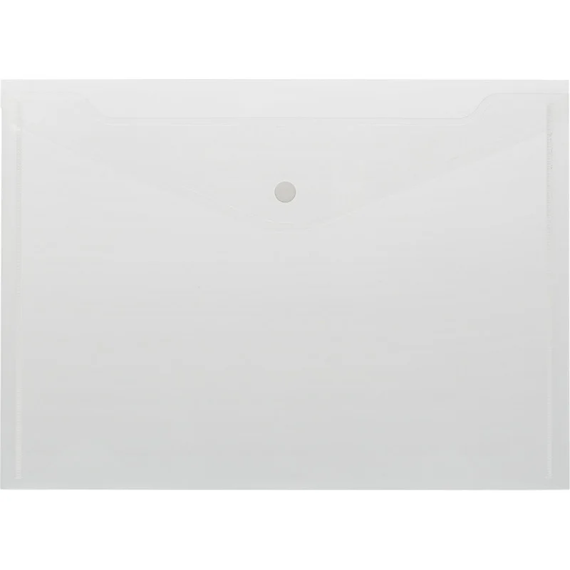 Папка-конверт формата А4 изготовлена из прозрачного пластика толщиной 0,18 мм бесцветного цвета. Из-за высокой плотности папки создается небольшой эффект матовости. Внешний размер составляет 236x330 мм. Закрывается на кнопку. Удобна для хранения и переноски документов, предотвращает их смятие и загрязнение. Вмещает до 120 листов стандартной плотности.