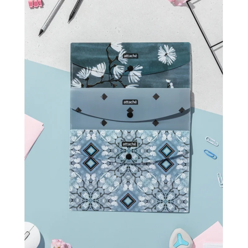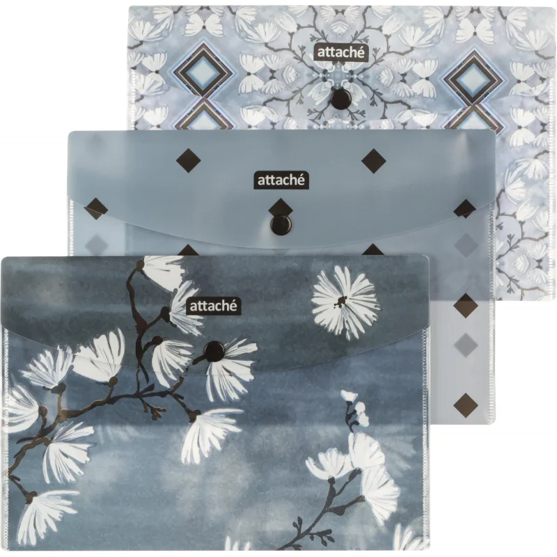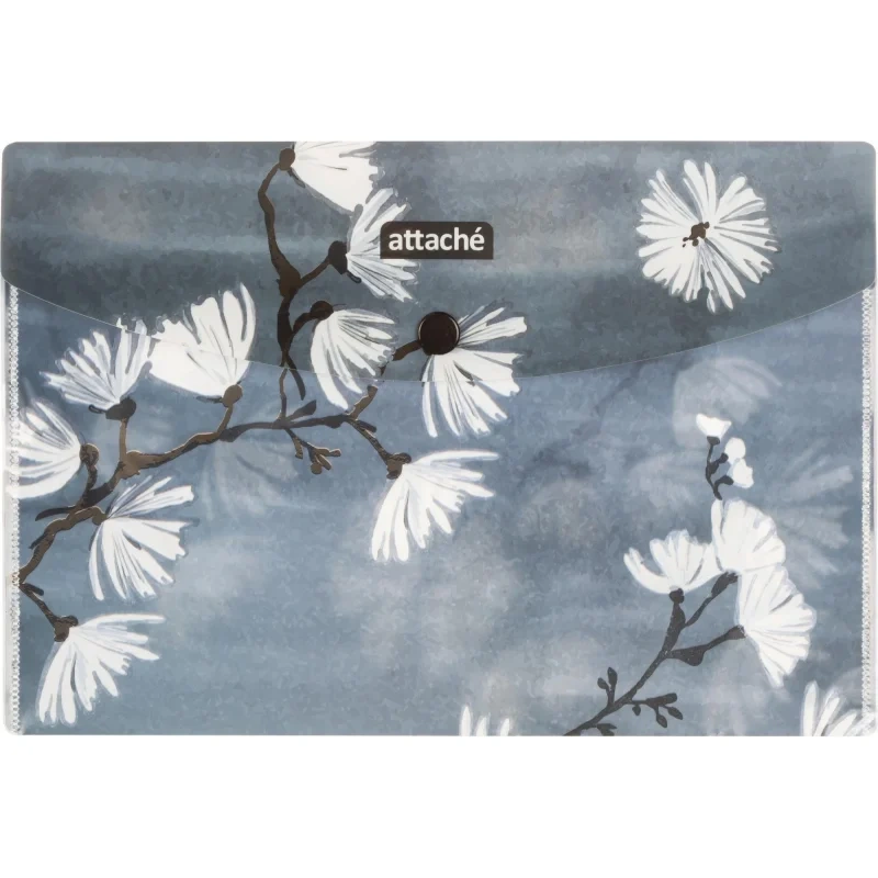 Папка-конверт на кнопке Attache Selection Японский сад, А5, 4шт/уп, 0,18мм Папка-конверт Attache Selection Японский сад А5 формата из экологичного полипропилена для хранения документов, 4 штуки в упаковке. Вмещает около 20 листов стандартной плотности. Плотность: 180 мкм.