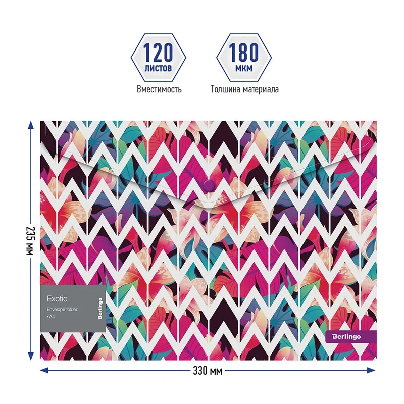 Папка-конверт пластиковая на кнопке Berlingo 'Exotic' формата А4 с рисунком. Надежная застежка-кнопка. Быстрый доступ к документам. Изготовлена из высококачественного полипропилена с матовой текстурой поверхности 'апельсиновая корка', на которой не видно отпечатков пальцев и мелких царапин. Предназначена для хранения документов. Толщина 180мкм. Вмещает до 120 листов. Упаковка в прозрачный пакет по форме на 12шт. Индивидуальный штрих-код на каждой папке-конверте на съемном стикере с информацией.