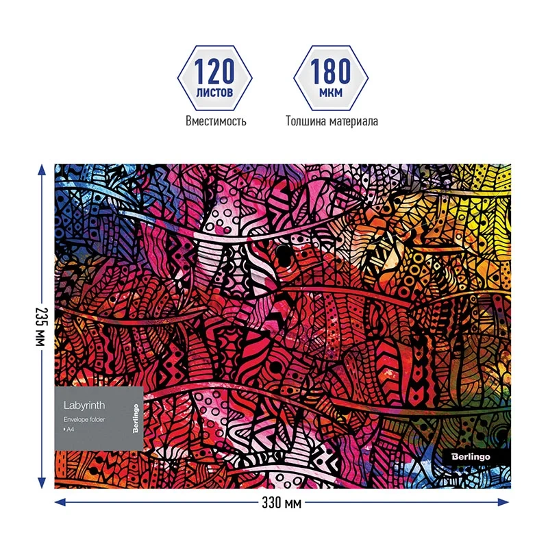 Папка-конверт пластиковая на кнопке Berlingo 'Labyrinth' формата А4 с рисунком. Надежная застежка-кнопка. Быстрый доступ к документам. Изготовлена из высококачественного полипропилена с матовой текстурой поверхности 'апельсиновая корка', на которой не видно отпечатков пальцев и мелких царапин. Предназначена для хранения документов. Толщина 180мкм. Вмещает до 120 листов. Упаковка в прозрачный пакет по форме на 12шт. Индивидуальный штрих-код на каждой папке-конверте на съемном стикере с информацией.