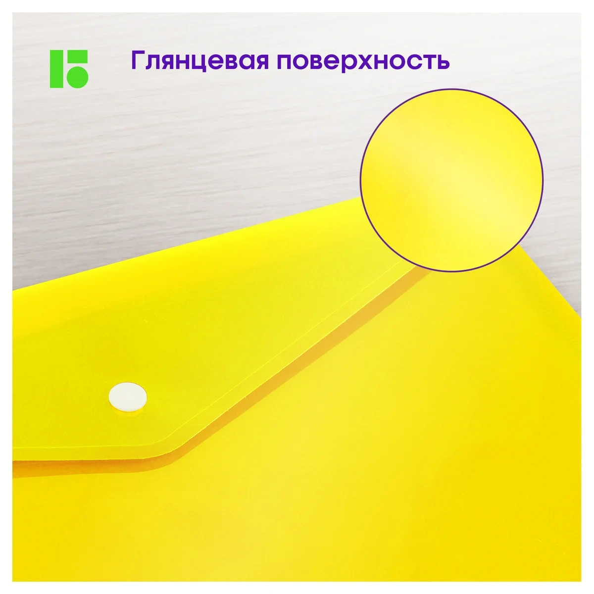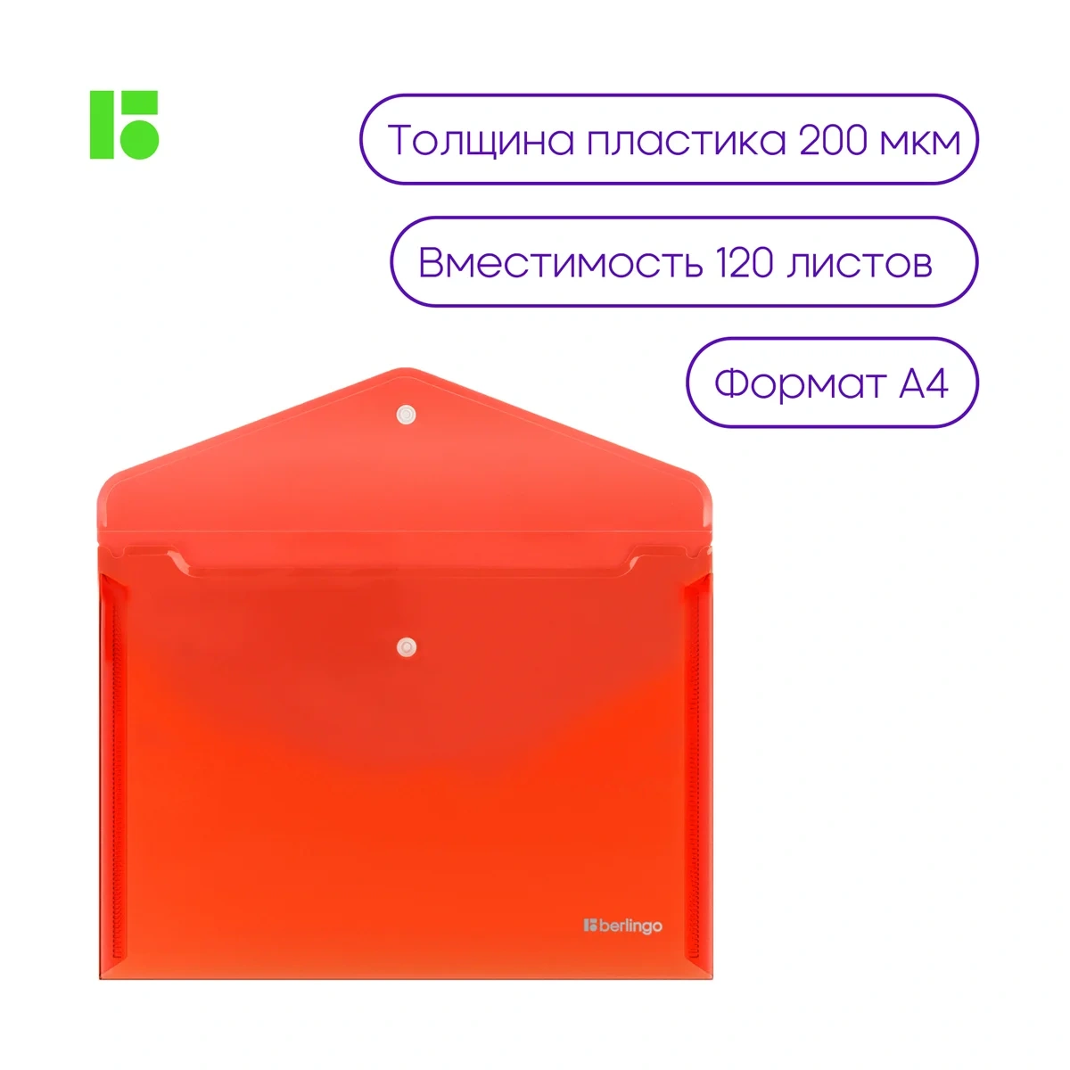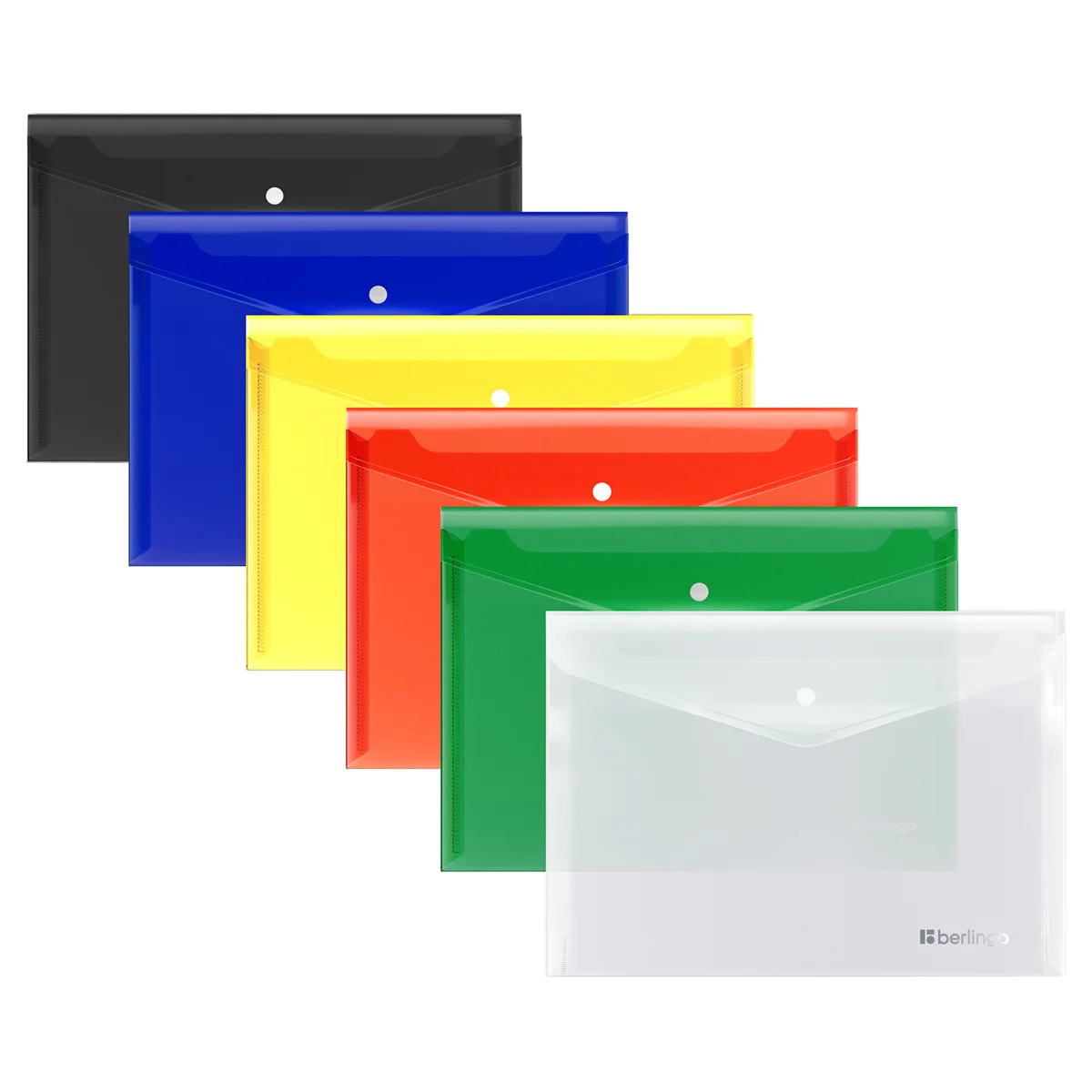 Папка-конверт на кнопке Berlingo No Secret формата А4 (333*236 мм) предназначена для хранения документов и вмещает до 120 листов. Изготовлена из высококачественного полипропилена плотностью 200 мкм с глянцевой текстурой поверхности. Папка плотно закрывается на надёжную застёжку-кнопку, которая рассчитана на ежедневное использование и защищает документы от повреждений и загрязнений и станет отличным помощником в учёбе и работе. Ассорти из 6 цветов: синий, желтый, зелёный, красный, чёрный, прозрачный. Полупрозрачная поверхность.