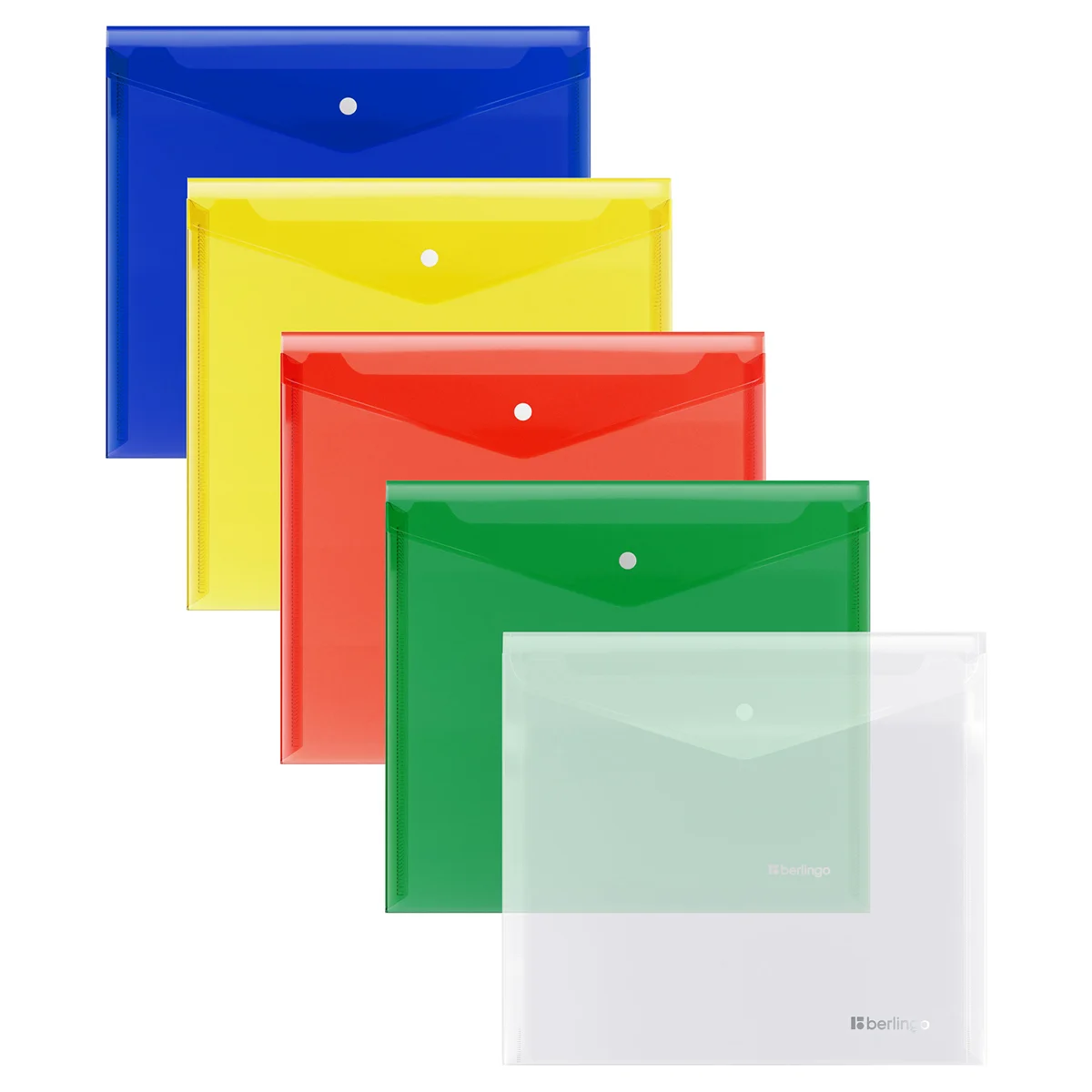 Папка-конверт на кнопке Berlingo No Secret формата А5+ (240*215 мм) предназначена для хранения документов и вмещает до 100 листов. Изготовлена из высококачественного полипропилена плотностью 200 мкм с глянцевой текстурой поверхности. Папка плотно закрывается на надёжную застёжку-кнопку, которая рассчитана на ежедневное использование и защищает документы от повреждений и загрязнений и станет отличным помощником в учёбе и работе. Ассорти из 5 цветов. Полупрозрачная поверхность.
