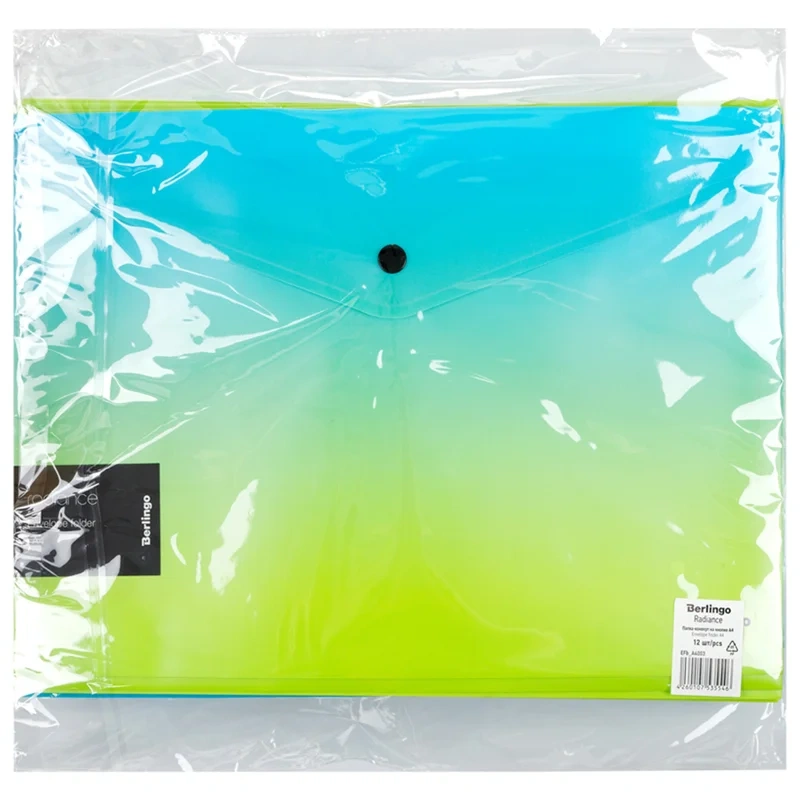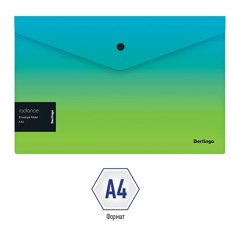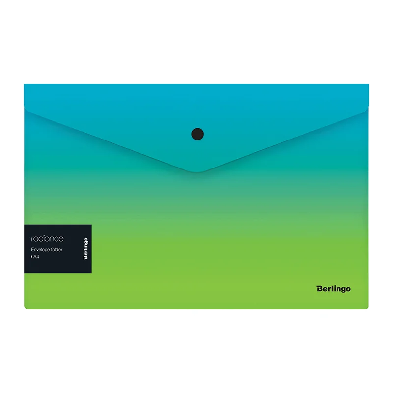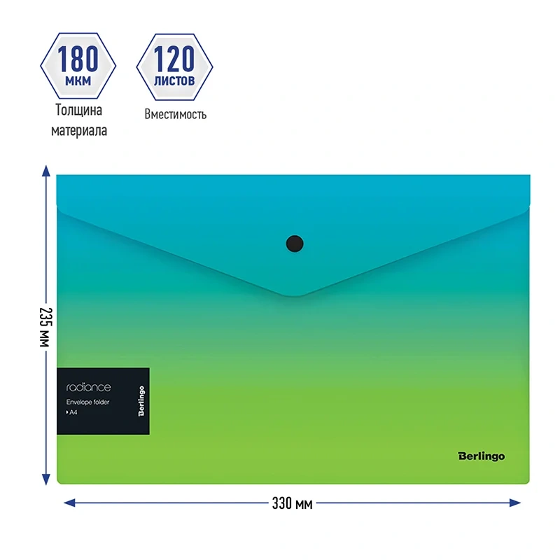 Папка-конверт Berlingo серии Radiance формата А4 на кнопке станет стильным аксессуаром для работы и учебы. Папка размером 330*235 мм изготовлена из высококачественного полипропилена с голубым/зелёным градиентом и толщиной 180 мкм с матовой текстурой поверхности 'песок', на которой не видно отпечатков пальцев и мелких царапин. Предназначена для хранения и переноски документов, предотвращает их смятие и загрязнение. Индивидуальная наклейка на каждом конверте со штрих-кодом и общей информацией. Имеет вертикальную ориентацию. Изделие обеспечивает быстрый доступ к документам.Папка плотно закрывается на кнопку и вмещает до 120 листов. Индивидуальная упаковка в пакет. Индивидуальный штрих-код на каждой папке-конверте на съемном стикере с информацией.• Вместимость, в листах: 120;• Внешняя перфорация: нет;• Карман для визиток: нет;• Материал: пластик;• Ориентация: горизонтальная;• Подходит под персонализацию: нет;• Размер: 330*235 мм;• С расширением: нет;• Способ фиксации: кнопка;• Текстура: песок;• Толщина материала: 180 мкм;• Формат: А4;• Цвет: голубой/зелёный градиент.