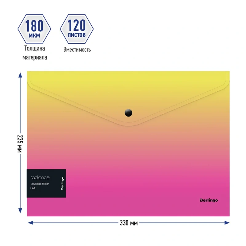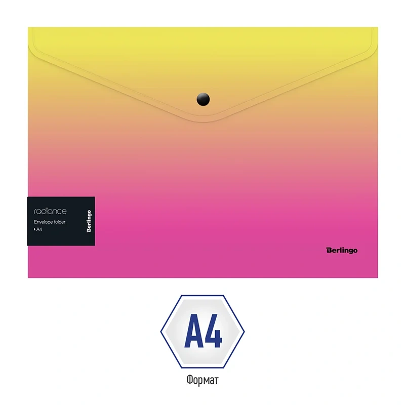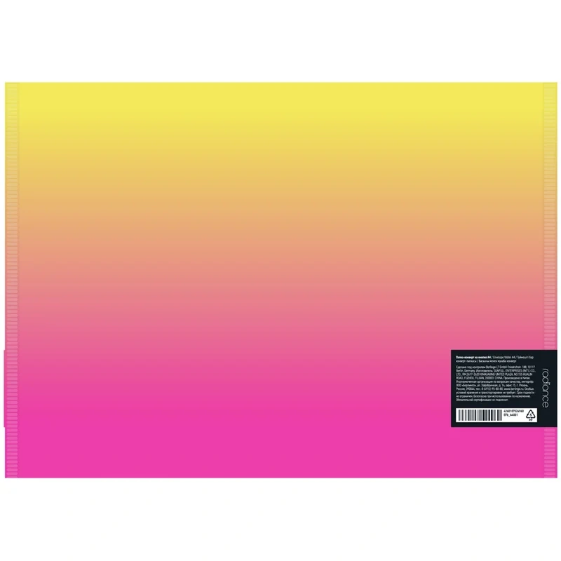 Папка-конверт Berlingo серии Radiance формата А4 на кнопке станет стильным аксессуаром для работы и учебы. Папка размером 330*235 мм изготовлена из высококачественного полипропилена с жёлтым/розовым градиентом и толщиной 180 мкм с матовой текстурой поверхности 'песок', на которой не видно отпечатков пальцев и мелких царапин. Предназначена для хранения и переноски документов, предотвращает их смятие и загрязнение. Индивидуальная наклейка на каждом конверте со штрих-кодом и общей информацией. Имеет вертикальную ориентацию. Изделие обеспечивает быстрый доступ к документам.