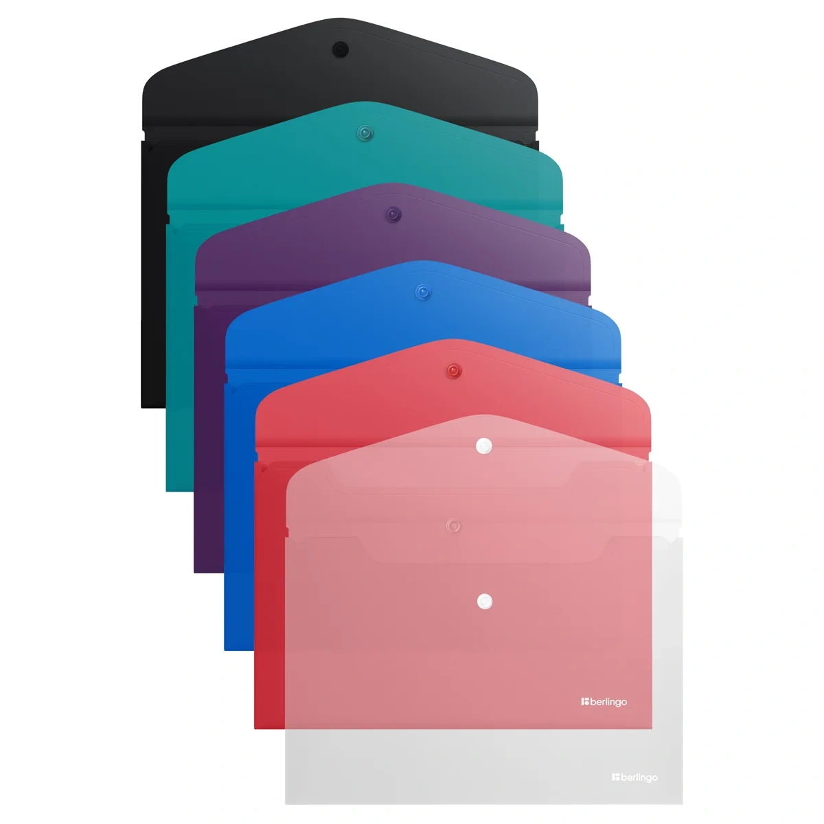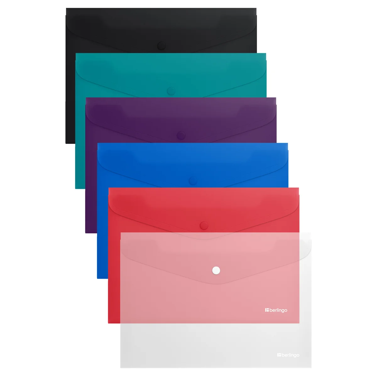 Пластиковая папка-конверт на кнопке Berlingo 'Soft Touch' формата А4. Уникальная матовая бархатистая софт-тач поверхность. Ассорти из 6 цветов. Надежная застежка-кнопка. Быстрый доступ к документам. Изготовлена из высококачественного полипропилена. Предназначена для хранения документов. Толщина 200 мкм. Вмещает до 120 листов. Упаковка в прозрачный пакет по форме на 6 шт. Индивидуальный штрих-код на каждой папке-конверте на съемном стикере с информацией.