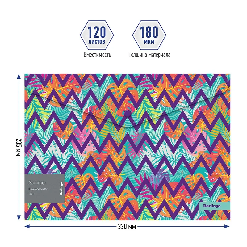 Папка-конверт пластиковая на кнопке Berlingo 'Summer' формата А4 с рисунком. Надежная застежка-кнопка. Быстрый доступ к документам. Изготовлена из высококачественного полипропилена с матовой текстурой поверхности 'апельсиновая корка', на которой не видно отпечатков пальцев и мелких царапин. Предназначена для хранения документов. Толщина 180мкм. Вмещает до 120 листов. Упаковка в прозрачный пакет по форме на 12шт. Индивидуальный штрих-код на каждой папке-конверте на съемном стикере с информацией.
