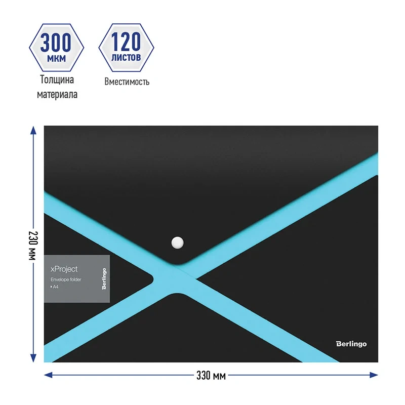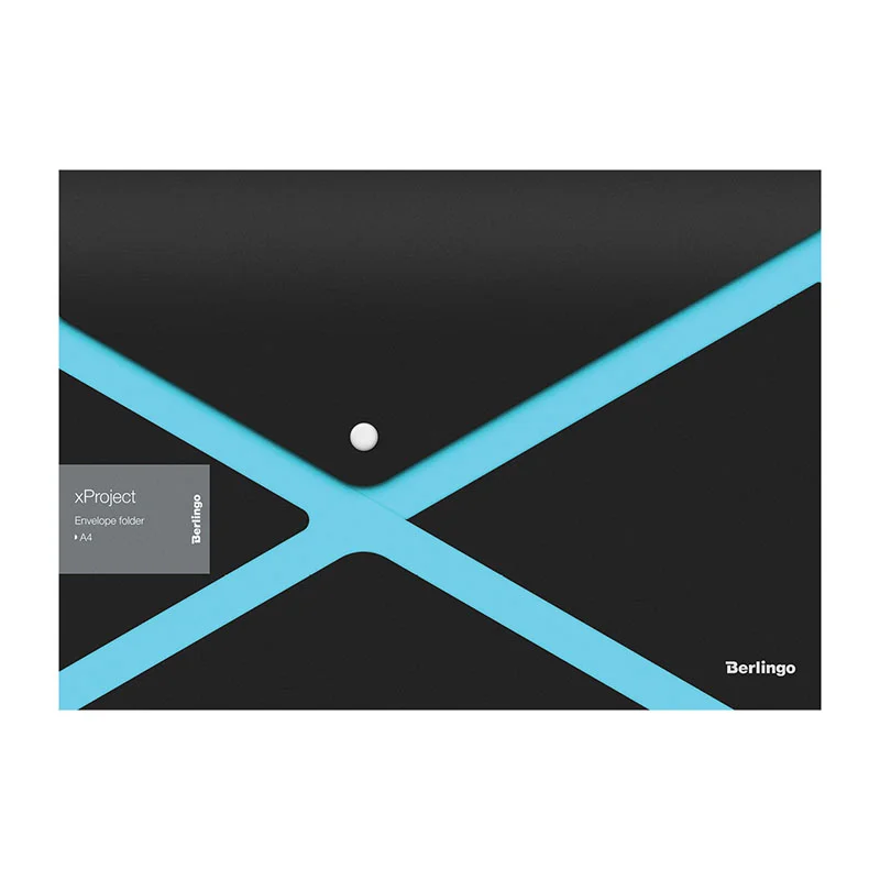 Папка-конверт на кнопке Berlingo 'xProject', черная/голубая, 300мкм