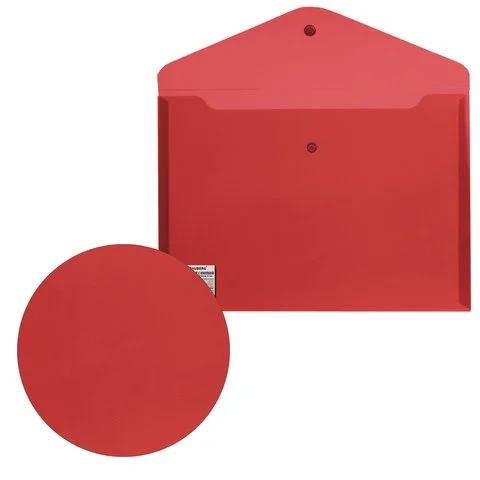 Папка-конверт с гладкой фактурой формата А4 изготовлена из плотного пластика красного цвета толщиной 200 мкм. Закрывается на защелку-кнопку, что делает удобным частое использование и обеспечивает быстрый доступ к ее содержимому. Папка способна вместить до 100 листов стандартной плотности.