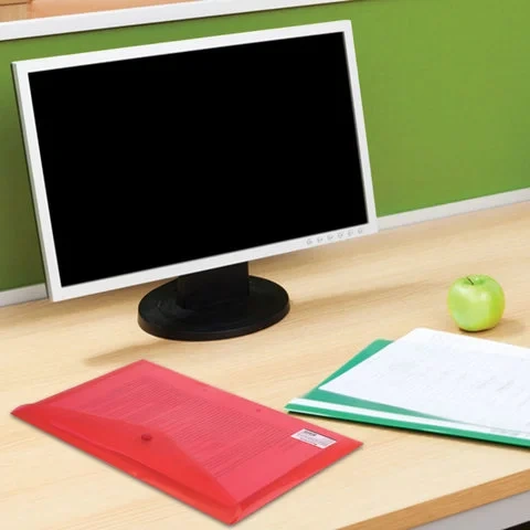 Папка-конверт с гладкой фактурой формата А4 изготовлена из плотного прозрачного пластика красного цвета толщиной 180 мкм. Закрывается на защелку-кнопку, что обеспечивает удобство частого использования и быстрый доступ к содержимому. Папка способна вместить до 100 листов стандартной плотности.