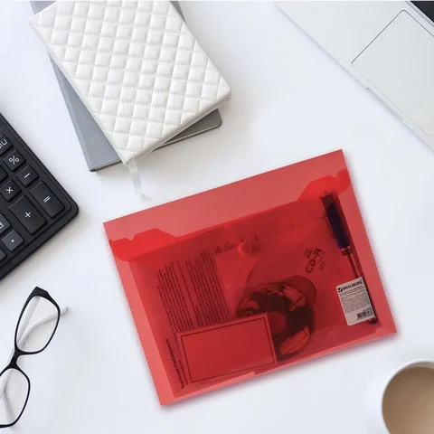 Папка-конверт с гладкой фактурой малого формата А5 изготовлена из плотного прозрачного пластика красного цвета толщиной 180 мкм. Закрывается на защелку-кнопку, что делает удобным частое использование и обеспечивает быстрый доступ к ее содержимому. Папка способна вместить до 100 листов стандартной плотности.