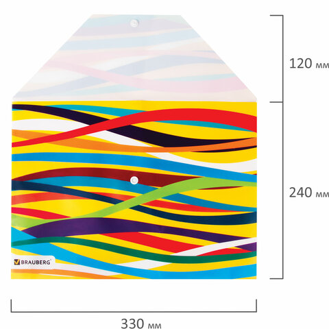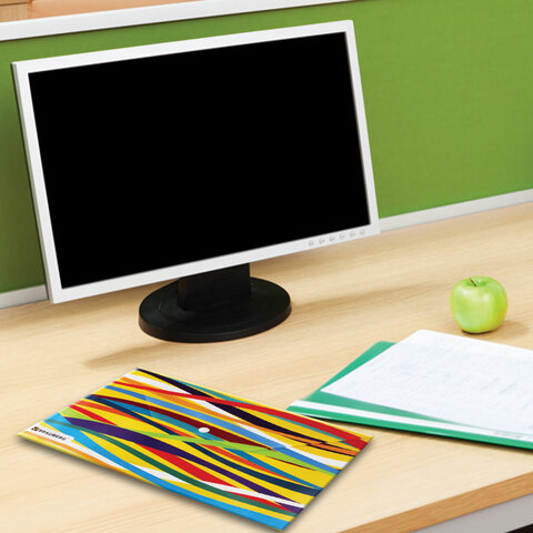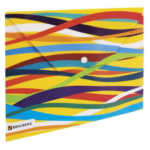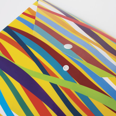 Папка-конверт с гладкой фактурой формата А4 изготовлена из плотного пластика с рисунком в виде разноцветных полос толщиной 180 мкм. Закрывается на защелку-кнопку, что делает удобным частое использование и обеспечивает быстрый доступ к ее содержимому. Папка способна вместить до 100 листов стандартной плотности.