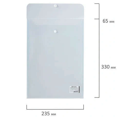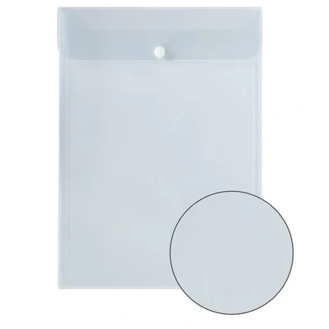 Папка-конверт с гладкой фактурой формата А4 изготовлена из плотного прозрачного пластика толщиной 150 мкм. Закрывается на защелку-кнопку, что делает удобным частое использование и обеспечивает быстрый доступ к ее содержимому. Папка способна вместить до 100 листов стандартной плотности.