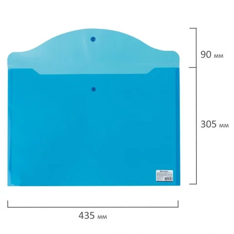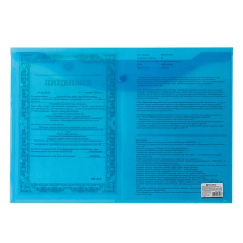 Папка-конверт с гладкой фактурой размера А3 изготовлена из плотного прозрачного пластика синего цвета толщиной 180 мкм. Закрывается на защелку-кнопку, что делает удобным частое использование и обеспечивает быстрый доступ к ее содержимому. Папка способна вместить до 100 листов стандартной плотности.