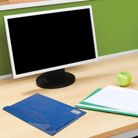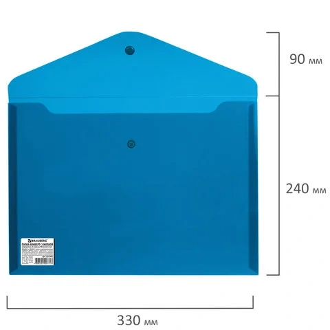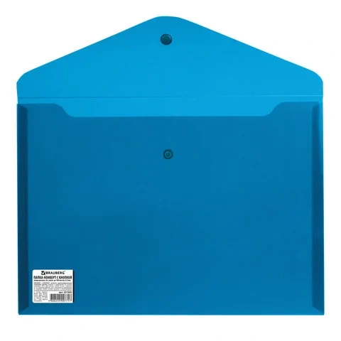 Папка-конверт с гладкой фактурой формата А4 изготовлена из плотного пластика синего цвета толщиной 200 мкм. Закрывается на защелку-кнопку, что делает удобным частое использование и обеспечивает быстрый доступ к ее содержимому. Папка способна вместить до 100 листов стандартной плотности.
