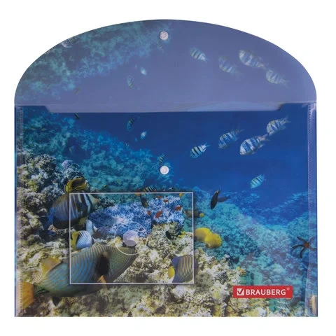 Папка-конверт формата А4 из плотного пластика в 160 мкм с полноцветной печатью. Закрывается на защелку-кнопку, что способствует удобству для частого использования и обеспечивает быстрый доступ к бумагам. Вместительность до 100 листов поможет хранить или взять с собой необходимые документы. Гладкая фактура с полноцветным рисунком водного мира всегда завораживает своей красотой. Папка BRAUBERG практична в использовании и надежно защитит документы и сбережет их от повреждений, пыли и влаги.