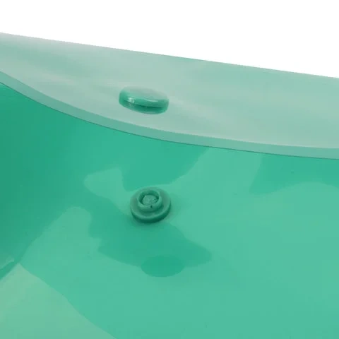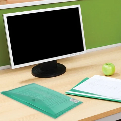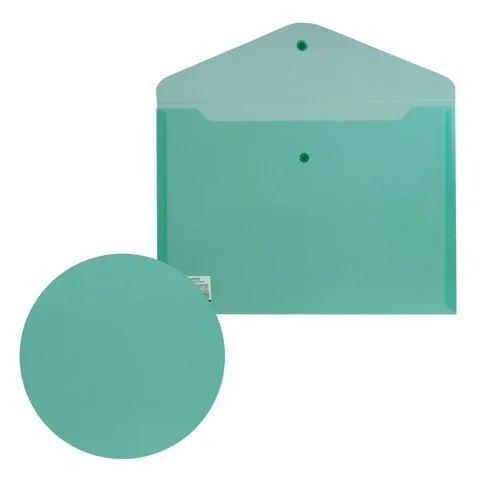 Папка-конверт с гладкой фактурой формата А4 изготовлена из плотного прозрачного пластика зеленого цвета толщиной 180 мкм. Закрывается на защелку-кнопку, что делает удобным частое использование и обеспечивает быстрый доступ к ее содержимому. Папка способна вместить до 100 листов стандартной плотности.