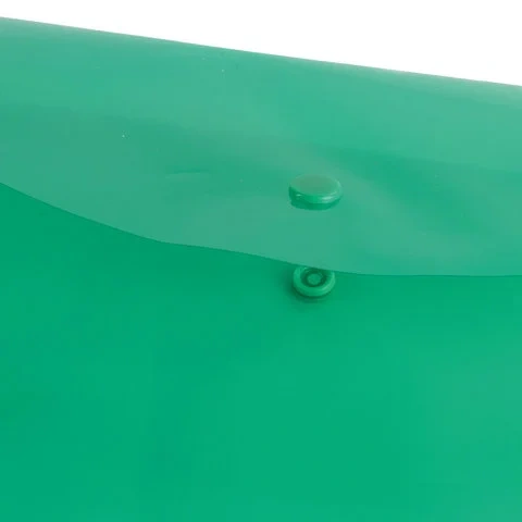 Папка-конверт с гладкой фактурой формата А4 изготовлена из плотного прозрачного пластика зеленого цвета толщиной 150 мкм. Закрывается на защелку-кнопку, что делает удобным частое использование и обеспечивает быстрый доступ к ее содержимому. Папка способна вместить до 100 листов стандартной плотности.