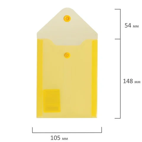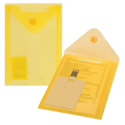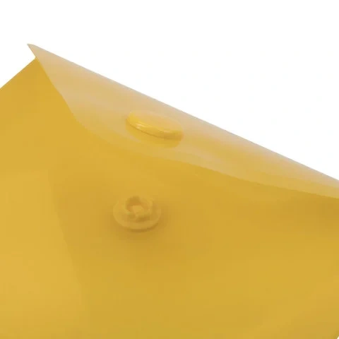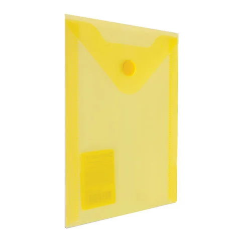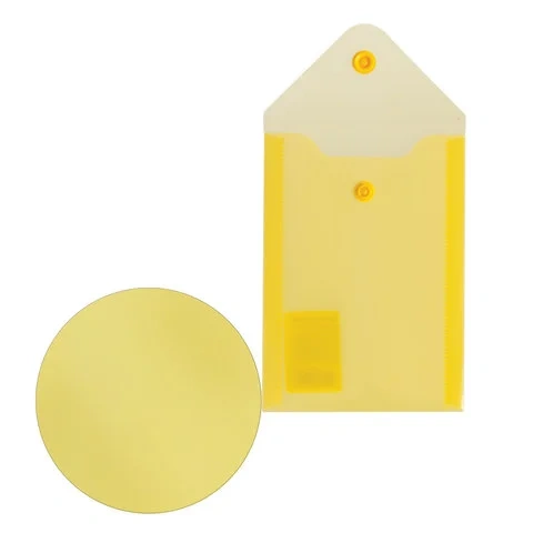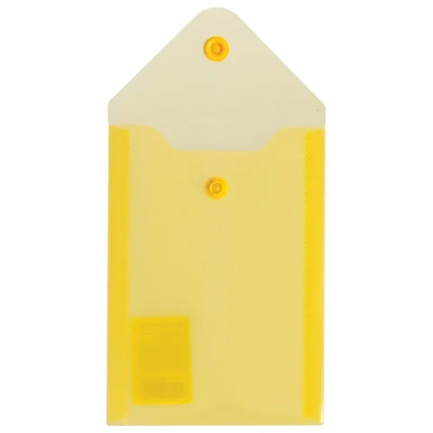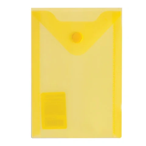 Папка-конверт с гладкой фактурой малого формата А6 изготовлена из плотного прозрачного пластика желтого цвета толщиной 180 мкм. Закрывается на защелку-кнопку, что делает удобным частое использование и обеспечивает быстрый доступ к ее содержимому. Папка способна вместить до 50 листов стандартной плотности.