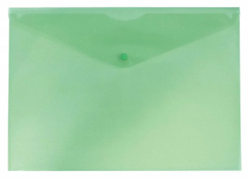 Конверт с кнопкой прозрачный. Формат А4. Выполнен из полипропилена толщиной 0,10мм. Фактура с тиснением. Цвет зеленый.